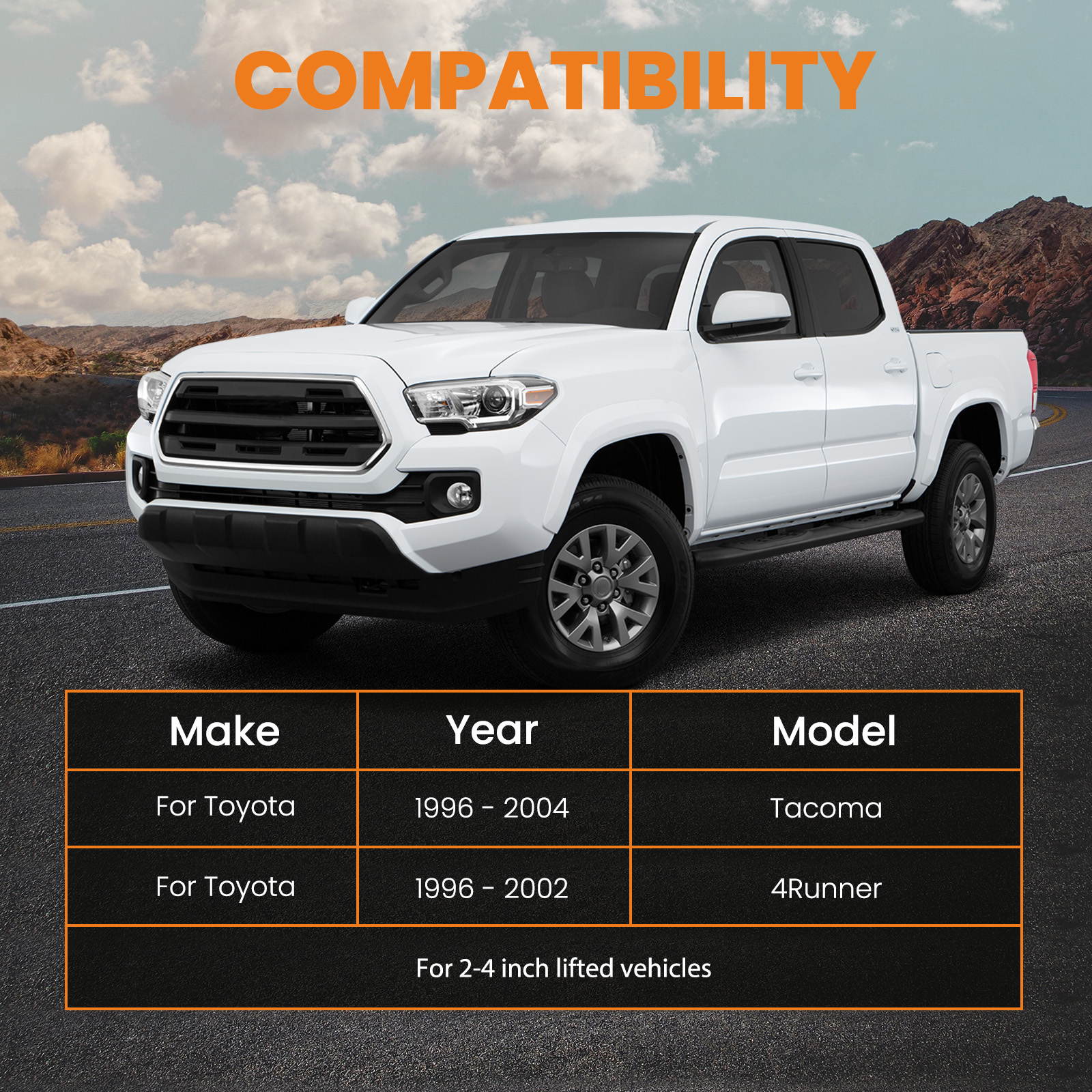 - Interchange Part Number: Upper Control Arms, Front Upper Control Arm, Control Arm Kit, Upper Control arm Lift Kit, 2-4" lift, Tubular Control arms, For Toyota Tacoma 1995-1997 1998 1999 2000 2001 2002 2003 2004, Front Control arms, For Toyota 4Runner 1996 - 2002 4X4 4WD 6 lug