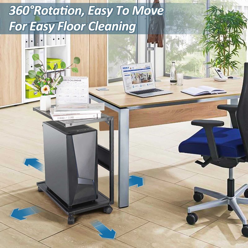 - Storage & Movement: The 2-layer shelf meets most storage needs. PC cases are placed on the bottom layer, and printers, plants, books, etc. are stored on the upper layer. The four universal wheels with brakes are easy to move and can remain stationary when in use.