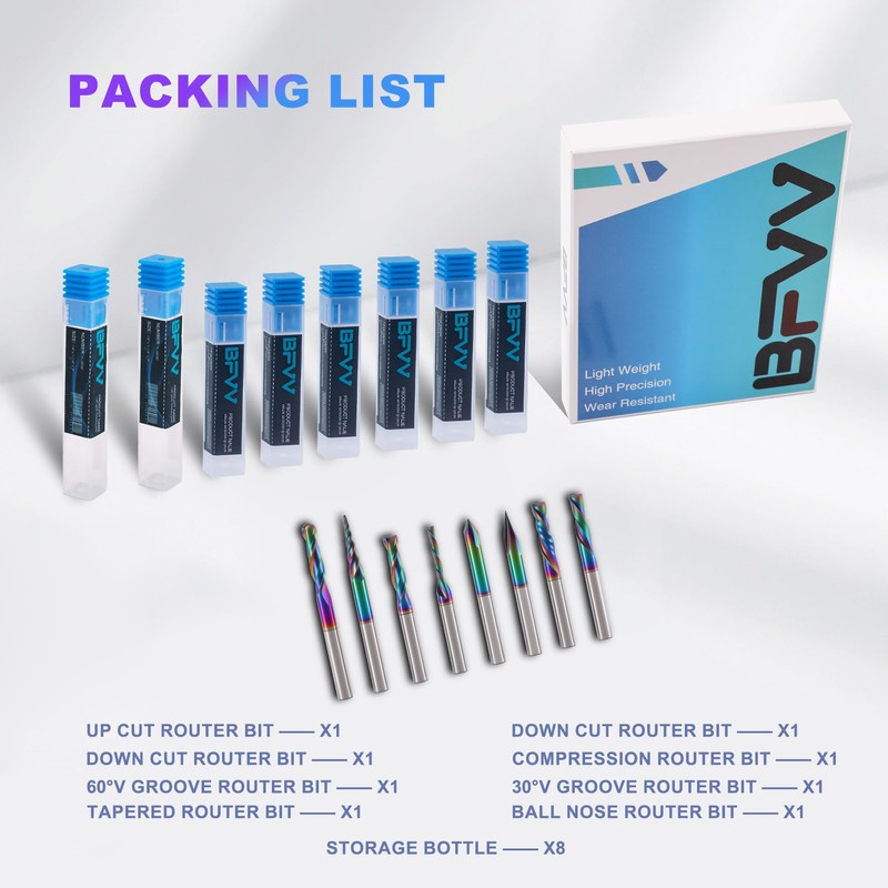 - 【8-Piece All-in-One Set】 This router bits set includes 8 high-performance CNC end mills with 1/4-inch shanks, each equipped with an individual plastic protective case. Ideal for both beginners and professionals, it's perfect for sign making, furniture crafting, and wood carving projects