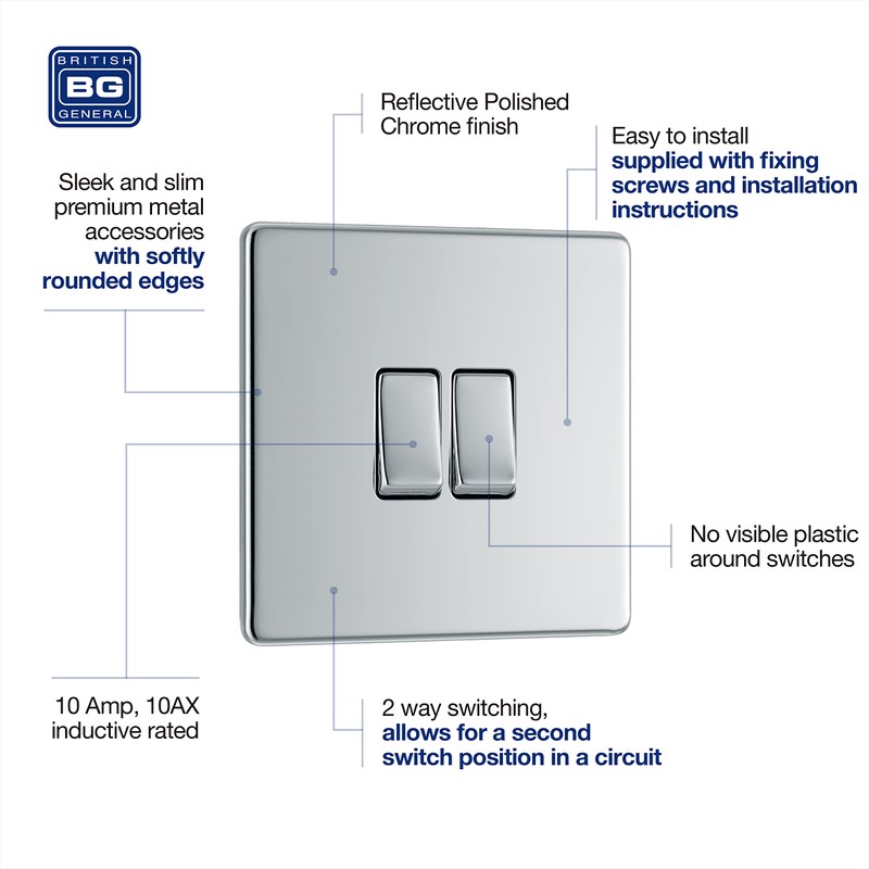 - SCREWLESS SLIM LINE POLISHED CHROME DOUBLE LIGHT SWITCH: From BG Electrical, has softly rounded corners with a screwless flat plate– giving a clean look that exudes modern elegance