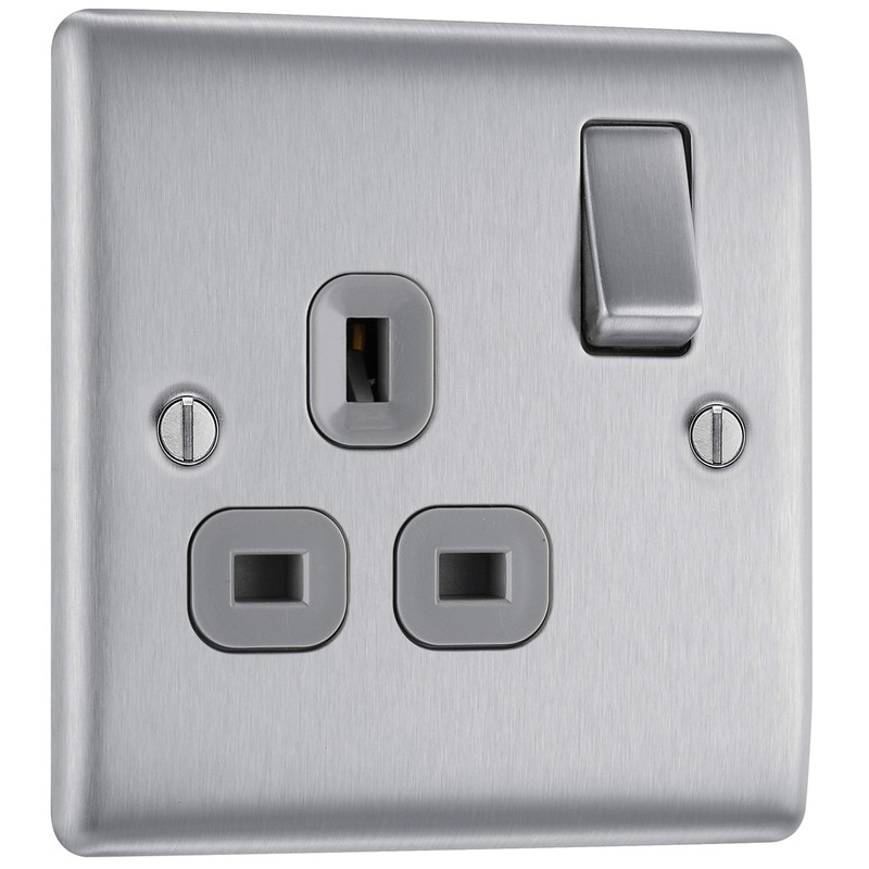 - SLEEK AND SLIM BRUSHED STEEL SINGLE SWITCHED POWER SOCKET: From BG Electrical, has softly rounded corners and colour matching fixing screws – combining quality with modern elegance