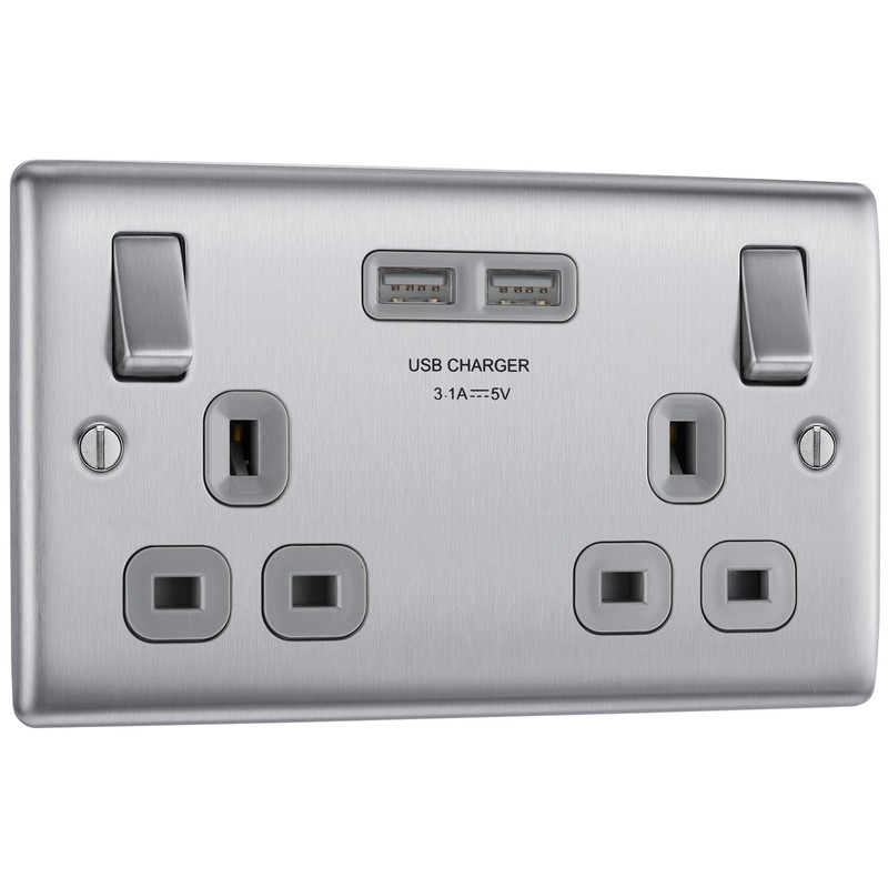 BG Electrical nbs22u3g Double Switched Fast Charging Power Socket with Two USB Charging Ports, 13 A, Brushed Steel with Grey Inserts