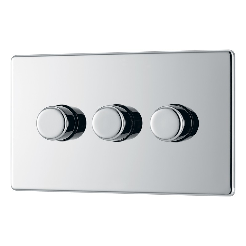- SCREWLESS SLIM LINE POLISHED CHROME TRIPLE PUSH DIMMER LIGHT SWITCH: From BG Electrical, has softly rounded corners, a round edge push dimmer switch with a screwless flat plate– giving a clean look that exudes modern elegance
