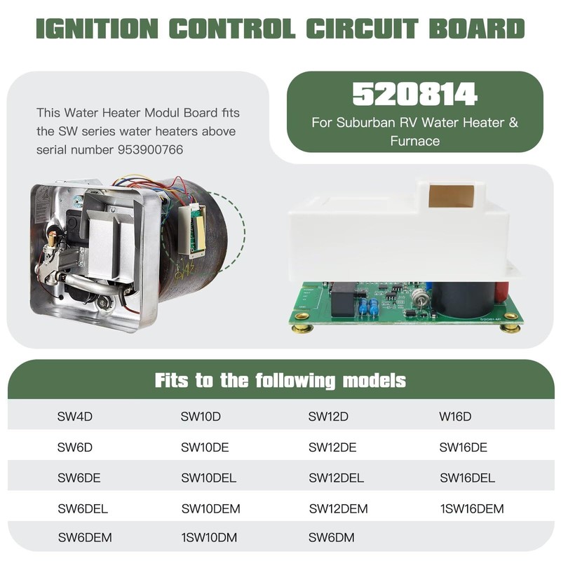 - ➤ Wide Model Fit – Compatible with models: SW4D, SW6D, SW6DE, SW6DEL, SW6DEM, SW6DM; SW10D, SW10DE, SW10DEL, SW10DEM, SW10DM; SW12D, SW12DE, SW12DEL, SW12DEM; W16D, SW16DE, SW16DEL, SW16DEM. For All Suburban Furnace And Water Heater Circuit Boards Including 520871, 520814, 520820, 33550L, AP4896608. This Water Heater Modul Board fits the SW series water heaters above serial number 953900766