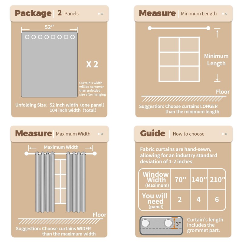Each pack includes 2 panels with bronze grommets (1.6" inner diameter), fitting most rods. Pro tip: For total lightproofing, (grommet gaps may allow minor leaks). Hang in minutes and enjoy smooth-gliding operation—no tools needed!
