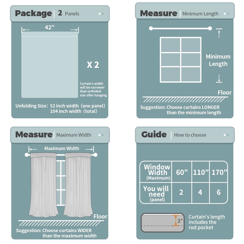 - EASY TO INSTALL: 2 curtain panels per package. Each lined blackout curtain measures 42 inches wide by 63 inches long, with 3 inches Rod Pocket on top, fits most curtain rods.
