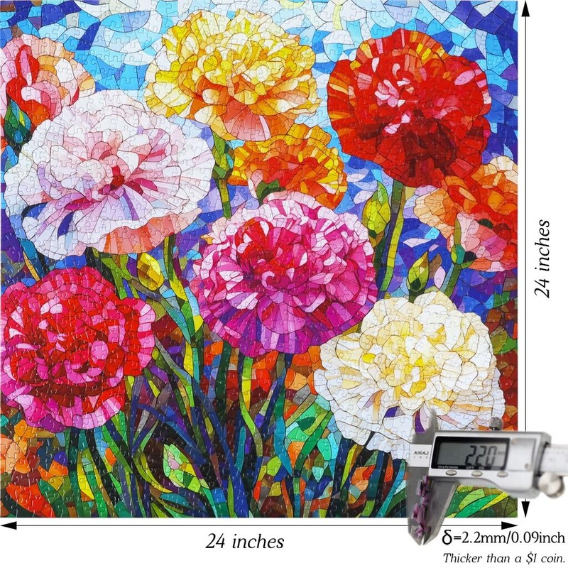 - Bgraamiens Puzzle- Carnation-1000 pieces Stained Glass Art Puzzle with Flowers, vibrant colors and colorful flowers under the blue sky. It will create a captivating puzzle experience for adults. Carnations Flowers puzzle can also be great mothers day gifts for who loves puzzles.