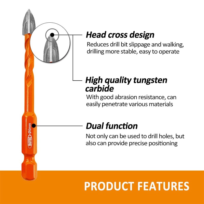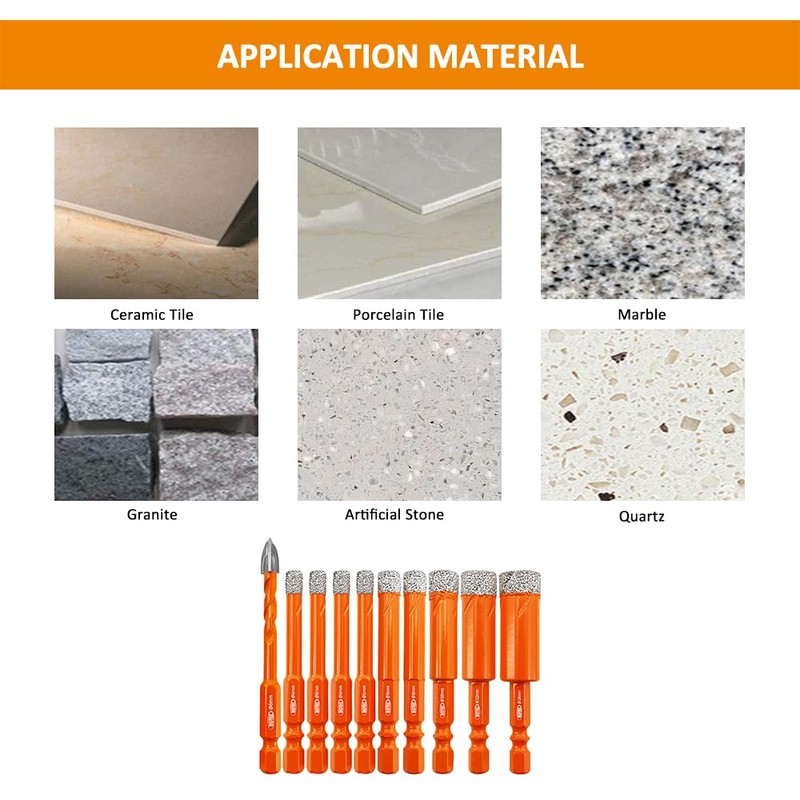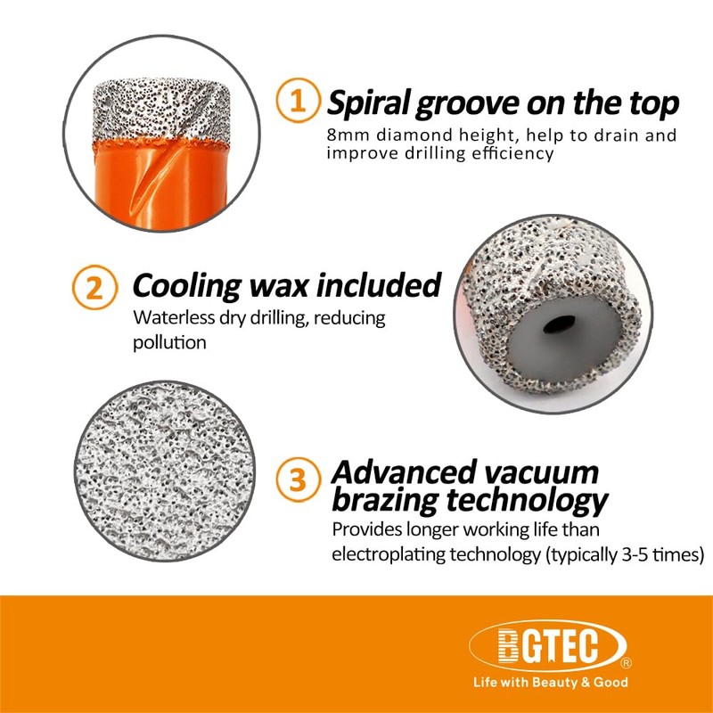 - The top of the drill bit with spiral grooves: 8MM diamond high, spiral grooves help to drain and prevent flying chips from clogging, improve drilling efficiency;