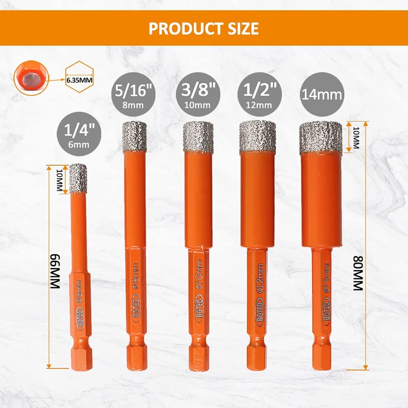 Specification: Hex shank Quick-fit , available diameter 6mm 1/4", 8mm 5/16", 10mm 3/8", 12mm, 14mm, diamond length 10mm 3/8"