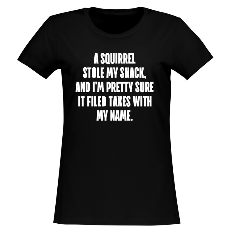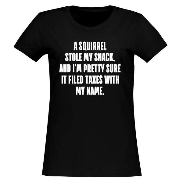 BH Cool Designs A Squirrel Stole My Snack, and I'm Pretty Sure it Filed Taxes with My Name. - Women's Soft & Comfortable Junior Cut T-Shirt CP05 Black