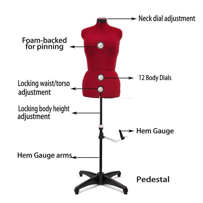 - 13 key adjustments (bust, waist, hips, neck/back) provide a perfect fit.Allows you to personalize the form to match your body measurements.Foam Vacked Nylon Cover for Easy Pinning and Marking.