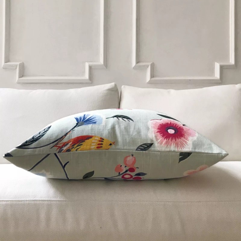 * Baby blue throw pillow featuring climbing stems and perched birds for a