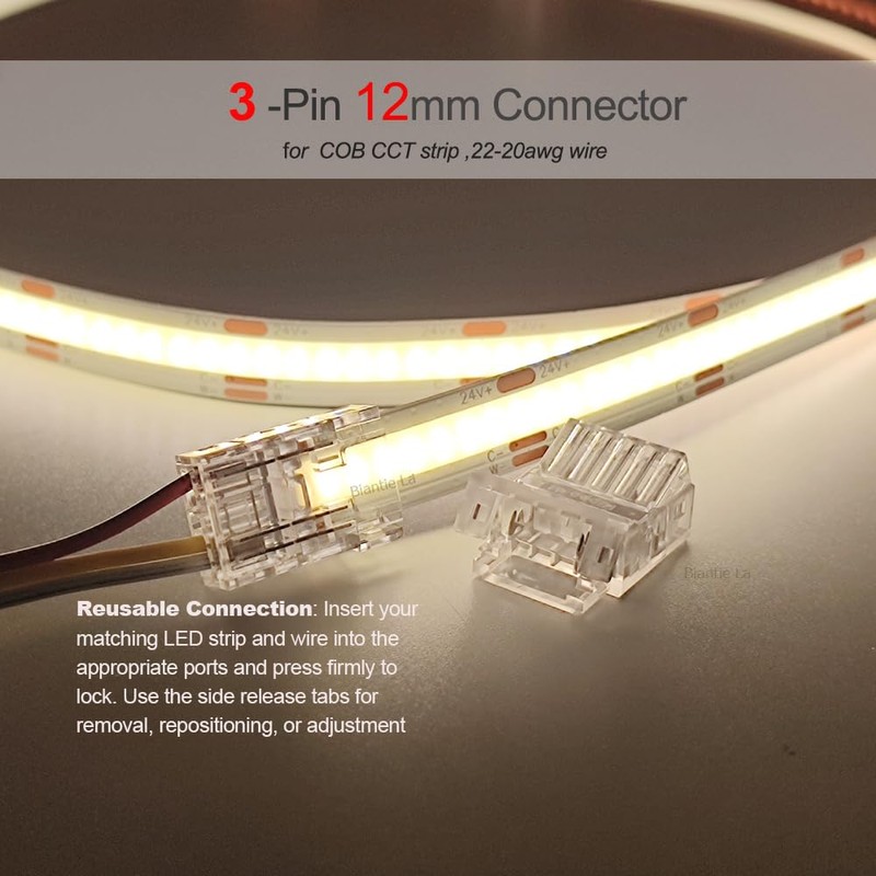 - Connector Type: 3-Pin LED Strip Connector for 12mm COB CCT strips