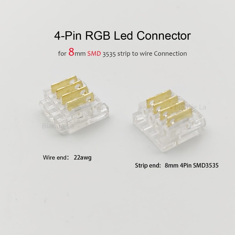 - 8mm 4-Pin RGB LED Strip Connector Kit: This 20-piece connector set is customized for 8mm wide SMD 5050 RGB LED strips with 4 solder pads. It is not compatible with 3mm, 5mm, 10mm, 12mm or other COB LED strip types.