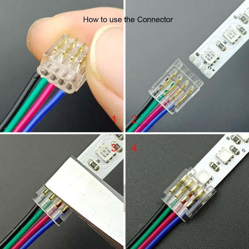 - Transparent Solderless Design: These 4-pin splices do not require any soldering. Use pliers (not included) to firmly press down and secure the copper tabs to pierce the strips and wires for conductivity. Press down slowly until the copper tabs are level with the surface of the connectors. Once secured, the clips cannot be detached or reused.