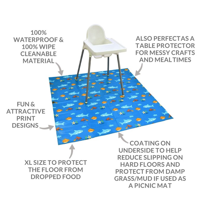 Bibetta XL Food Splash Mat for Under Highchair | 55 * 51 Inch Waterproof, Wipeable, Non-Slip Kids Messy Mat for Under Highchair| Soft Baby Mat for Weaning/Feeding/Playtime/Art/Activity (Blue Sea)