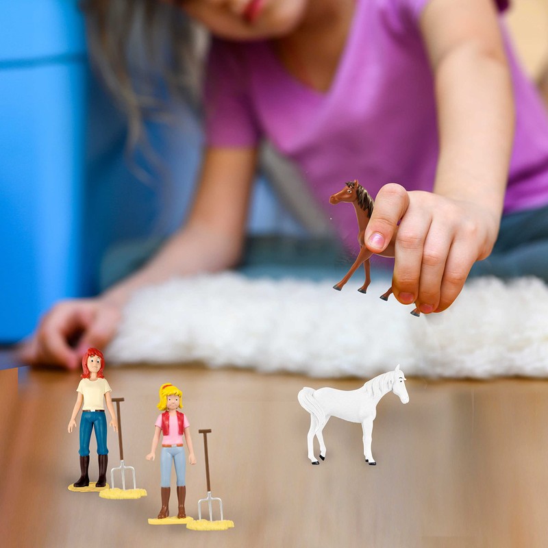 - “1 of 12 possible play sets included in a foil bag + collectors overview. Possible play sets: 1 horse (Sabrina, Amadeus, Maharadscha, Nora, Topsy, Kyra, Pascal) or 1 standing figure with hay and manure fork (Bibi, Tina) or a riding figure with saddle and halter (Bibi, Tina, Alexander).”