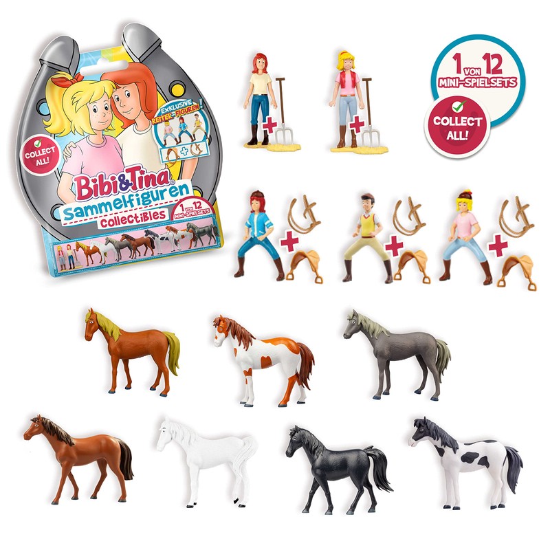 - “1 of 12 possible play sets included in a foil bag + collectors overview. Possible play sets: 1 horse (Sabrina, Amadeus, Maharadscha, Nora, Topsy, Kyra, Pascal) or 1 standing figure with hay and manure fork (Bibi, Tina) or a riding figure with saddle and halter (Bibi, Tina, Alexander).”