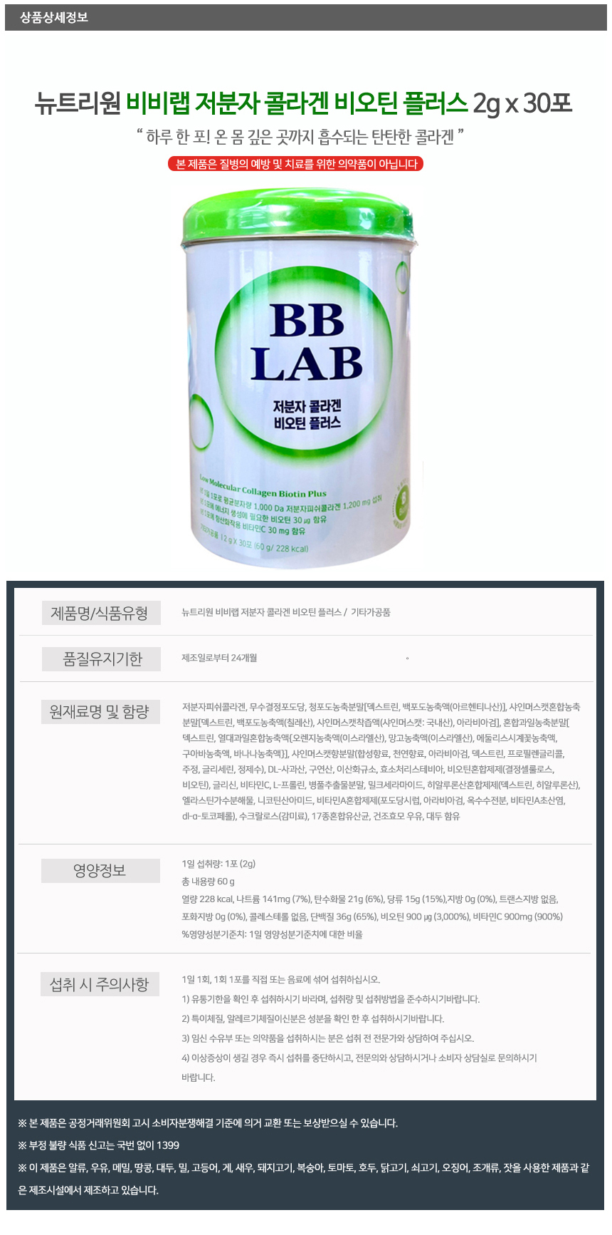 비비랩 저분자 콜라겐 비오틴 플러스 2g x 30포 x 2개