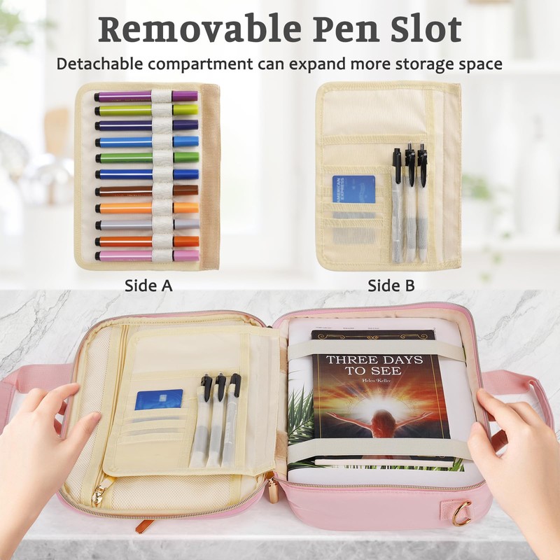 - 【Multifunctional Organizer】The front zipper pocket is perfect for your phone, wallet, and keys. The removable panel with pen slots inside and the mesh zipper pocket organize your pens, cards, notes, bookmarks, iPads, etc. Two elastic straps can better secure the bible or book.