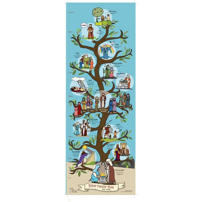 - FEATURES: A timeline illustration that connects Adam to Jesus with the popular people in the Bible they are related to such as Abraham, Jacob, David, Noah, Boaz, etc.