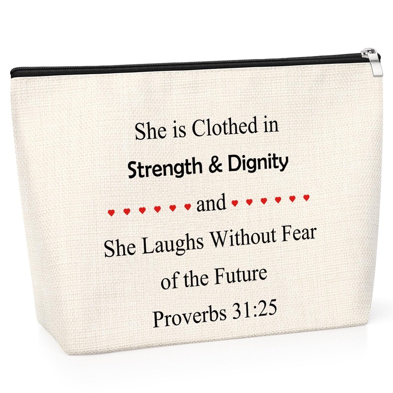 - Inspirational Gift for Women : Biblical Verse Cosmetic Bag "She is clothed in strength & dignity and she laughs without fear of the future. Proverbs 31:25" Inspirational biblical verses printed on cosmetic bags to help us become Be strong and confident.