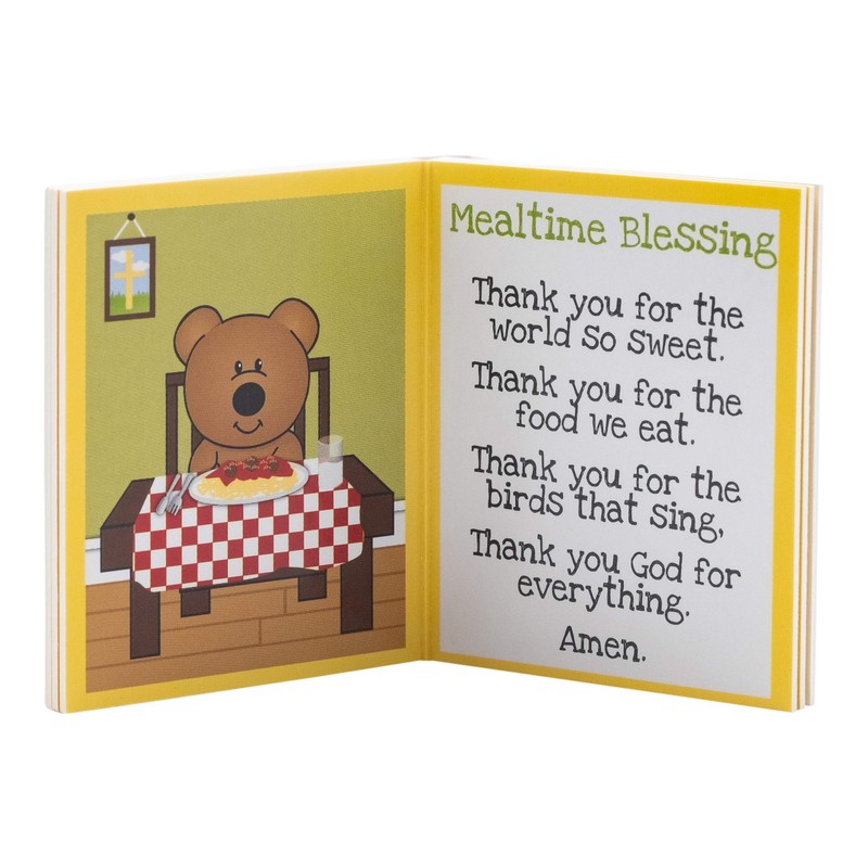 - Includes prayers: God Hear My Prayer, Our Father, Mealtime Blessing, and Bedtime Prayer