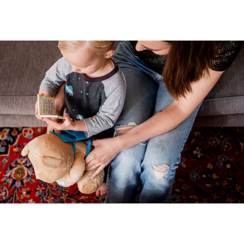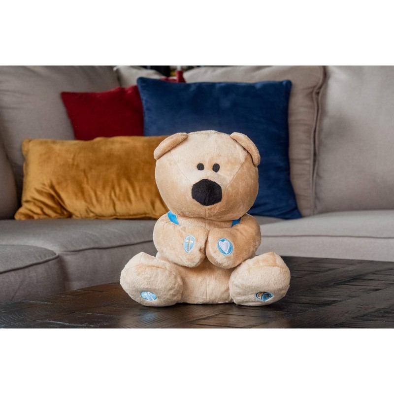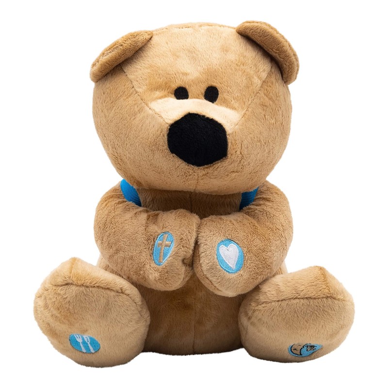 - 10 inch plush bear comes with a backpack, which includes a follow along book to the prayers