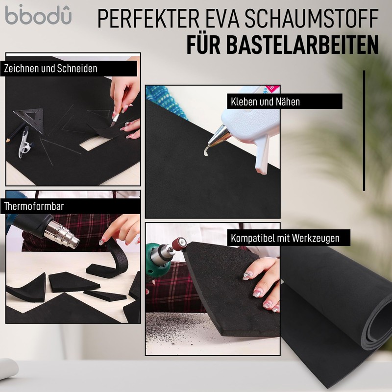 With our foam rubber self-adhesive in the roll, you can let your imagination run wild without restrictions. Whether you design craft projects, decorations or even cosplay with foam 5 mm or 2 mm, PE foam paper o foamboard 5 mm, this black or white foam self-adhesive of 5 mm or 2 mm is your perfect partner. Imagine the comfort of having enough material for your most ambitious projects. Genuine EVA foam panels
