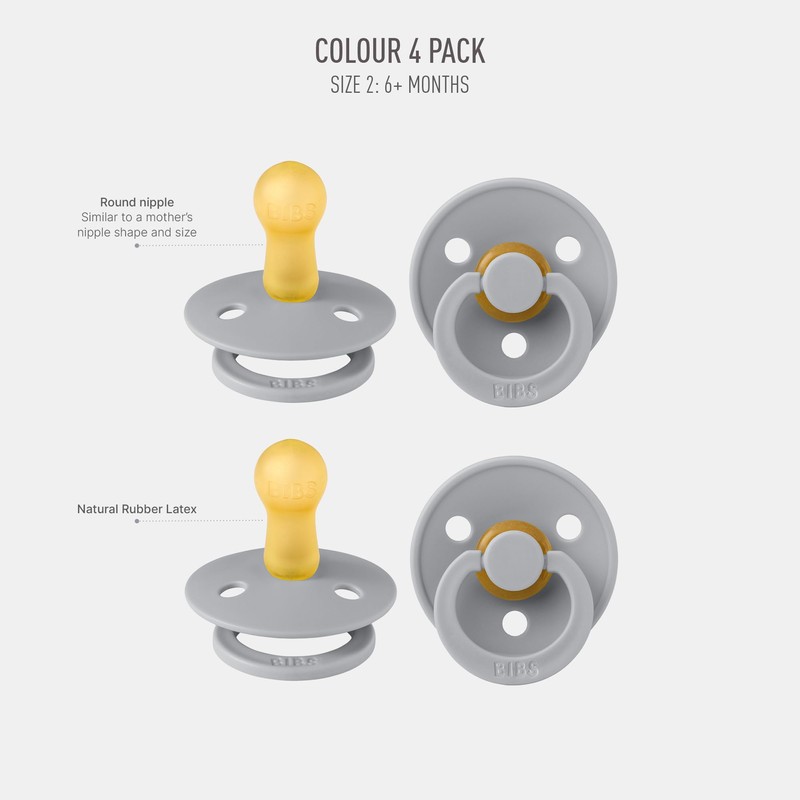 BIBS Colour Pacifier 4-Pack, BPA Free Dummy Pacifier, Round Nipple. Natural Rubber Latex, Made in Denmark, Size 2 (6-18 Months), Cloud