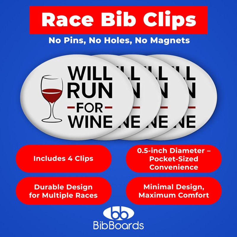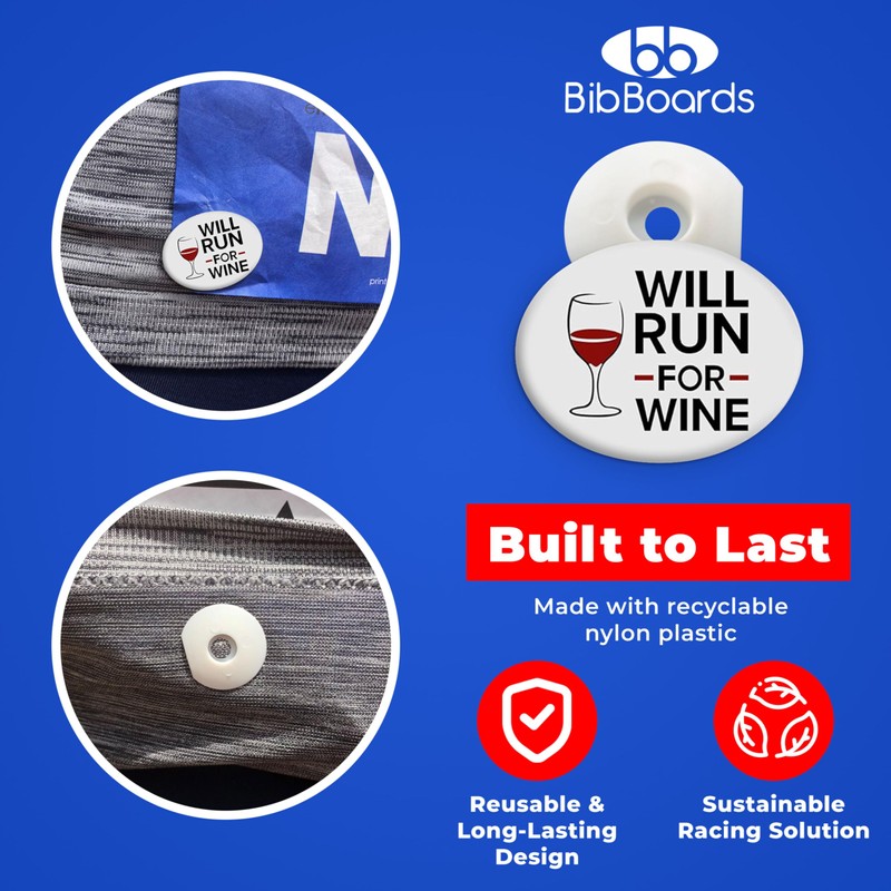 bibSNAPS Race Bib Clips - Safety Lock Fasteners - Secures Running, Marathon, Cycling, and Event Numbers, Non Magnetic, Easy to Use & Reusable, Replacement for Pins & Magnets - Will Run For Wine (4pcs)