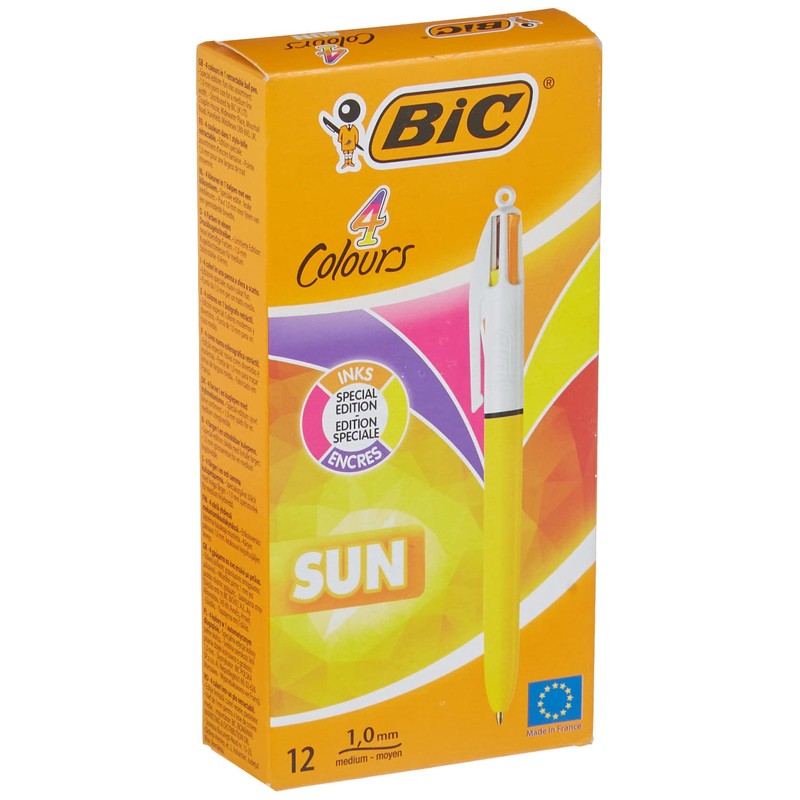 - The bright and cheery version of the famous BIC 4 Colours pen, the BIC 4 Colours Sun ballpoint pen contains 4 extraordinary ink colours: pink, purple, orange, and yellow for radiantly unique writing – plus it's perfect for underlining and circling key ideas and concepts. The BIC 4 Colours Sun pen is the best choice for adding a touch of fun to your writing, emphasising the main ideas and creating bullet journals. Each cartridge has a medium 1.0 mm point that’s great for all types of uses. Pick the one you need with a quick click and let the ideas flow onto the page. For over 65 years, BIC has been making premium writing products for everyone that are sold all over the globe. This mission has helped the French company nurture lasting trust among its customers and made it one of the world leaders in stationery supplies.
