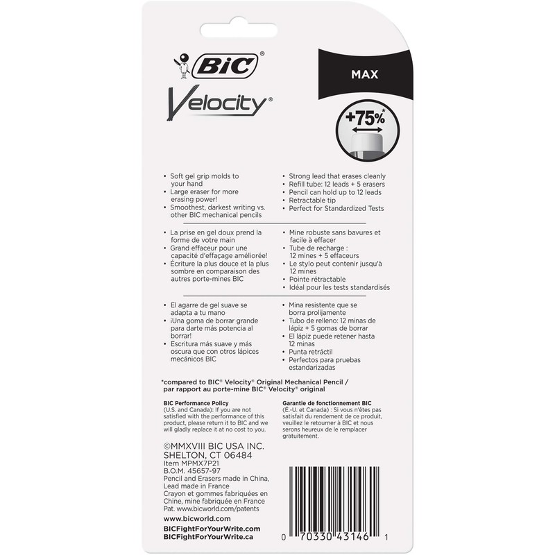 Enjoy a smooth, comfortable writing experience and plenty of erasing power with BIC Velocity Max Mechanical Pencils. These mechanical pencils feature strong lead that creates striking, noticeable lines and a large eraser that cleanly removes lead to make corrections easy.