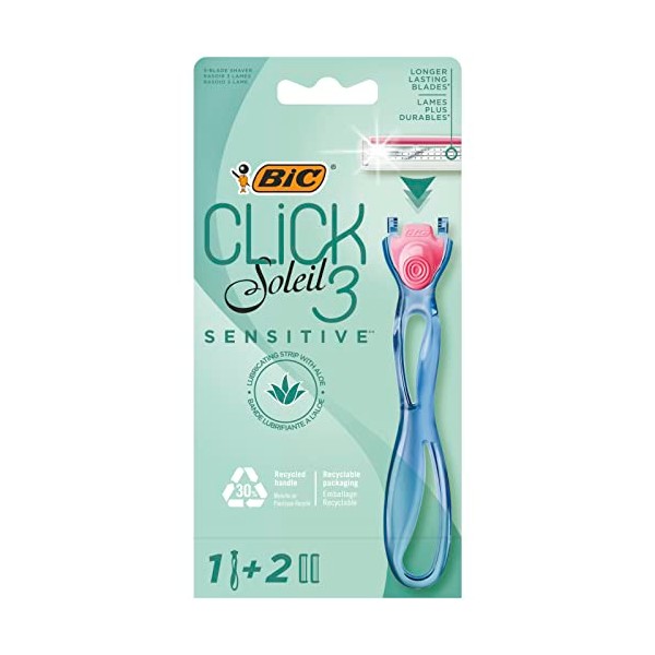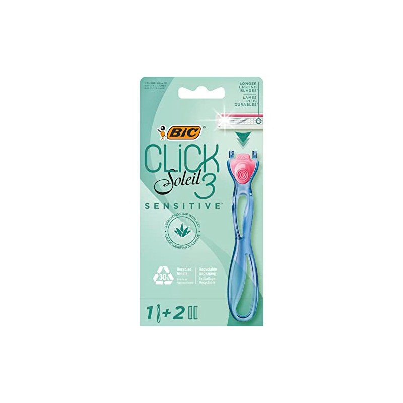 Bic Click 3 Soleil Sensitive Refillable Women's Razor, 30% Recycled Plastic Handle and 3-Blade Refills - Box of 1+2