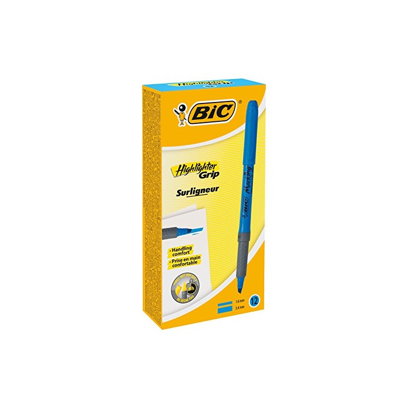 - Get straight to the main idea with the BIC Highlighter Grip pen. This box contains 12 highlighters in blue. It's simple and gets the job done, so all the most important information shines through. Never miss that crucial note or a special date in your agenda. This fluorescent highlighter pen has a ribbed rubber grip for extra comfort that helps prevent writer's cramp. Whether in the office, the classroom or at home, use these fluorescent colours to create a dynamite colour code that livens up your words and organises all your information. The rugged chiselled nib can adjust to varying widths. Perfect for highlighting or underlining without getting pushed in while writing. The convenient marker design makes it a great choice for pencil cases. Since 1950, BIC has been making top-quality products exported all over the world and sold for the best value. This mission has made this French company one of the world leaders in office supplies.