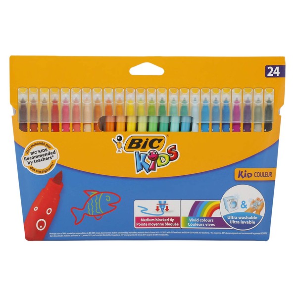 - The BIC Kids product range offers colouring tools specially designed to be easy for kids to use, help them grow and keep them safe. This cardboard wallet contains 24 felt-tip colouring pens in assorted colours (one of each). The Kid Couleur felt tips are intended for kids 5 and up for everyday colouring projects, plus they have other great features. They come in 24 bright colours for high-contrast drawings that pop off the page. Designed with a fixed medium nib that doesn't get pushed in with use, they can be used extensively for both intricate outlining and high-volume colouring. Never fret if kids draw on themselves, these colouring felt tips are super washable on skin and most fabrics. Dependable and durable Kid Couleur felt tip pens are made at BIC's plants based on time-honoured knowledge. You can thank the Kid Couleur felt tips, of course.