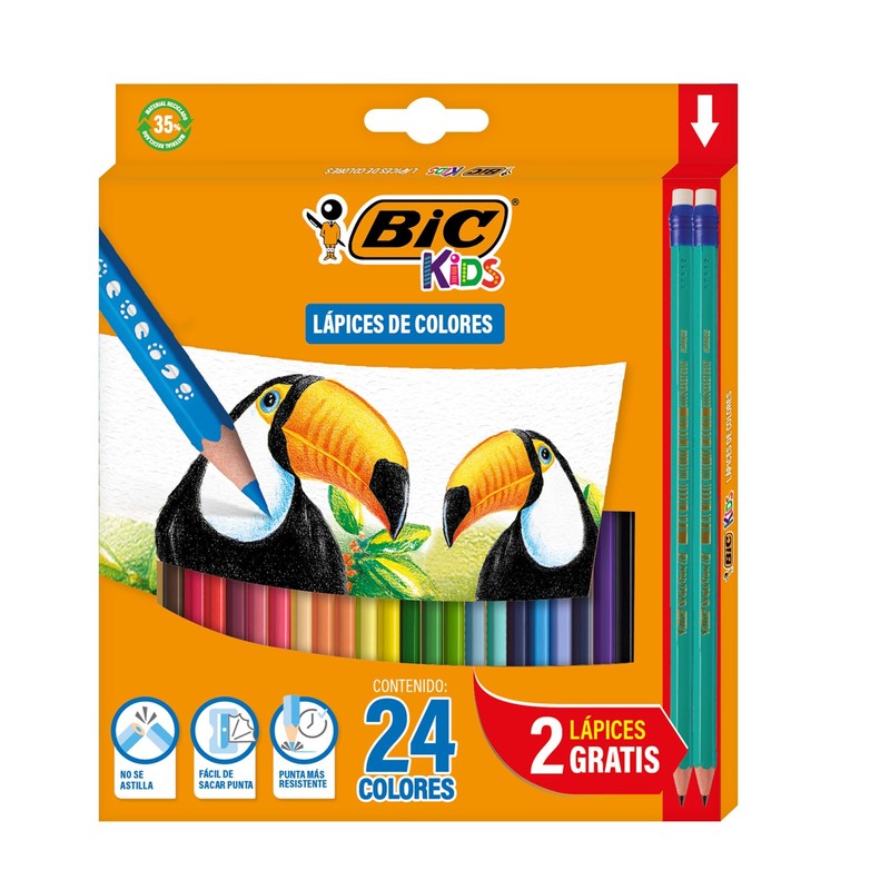 - ESPECIFICACIONES. Incluye un paquete de 24 lápices con gran variedad de colores y 2 lápices de BIC Evolution de regalo. El kit completo para que tus hijos se diviertan aprendiendo y disfruten de sus actividades escolares.
