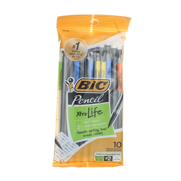 Designed to be durable, BIC Xtra-Life Mechanical Pencils come with smooth-writing leads that do not smudge and erase cleanly. One BIC Pencil equals 2 _ wood case pencils, offering a great value and performance. The lead advances quickly with just a click, so the pencil never needs sharpening. Perfect for standardized tests, each Xtra-Life Mechanical Pencil comes preloaded with three #2 leads that create smooth, legible lines. The clear barrel and colored clip make it a sophisticated choice for school, home, or office use. This pack contains 10 BIC Xtra-Life Mechanical Pencils.