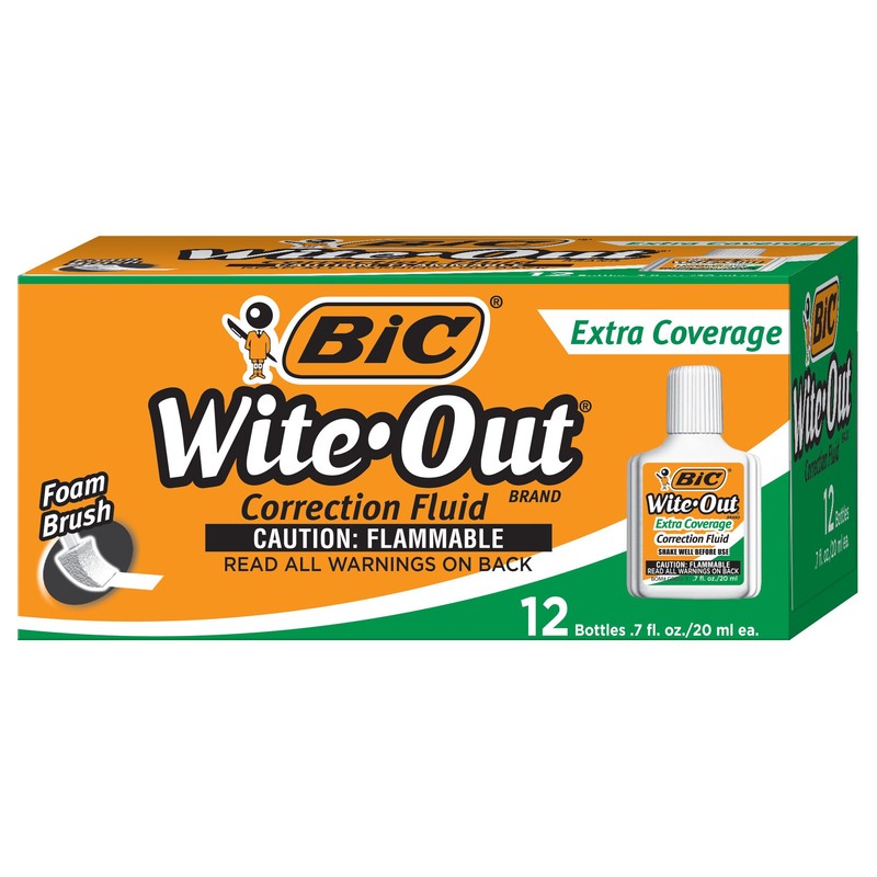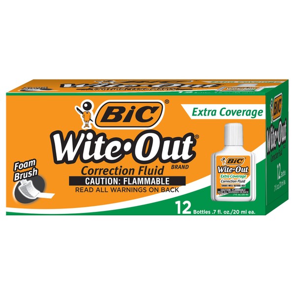 Cover even the toughest errors with BIC Wite-Out Brand Extra Coverage Correction Fluid. From America's #1 Correction Brand,* this bright white fluid covers even red ink and permanent marker. The correction fluid comes with a foam applicator for precise, even coverage on photocopies, faxes, and other documents. It dries to a smooth satin finish so you can easily make corrections and get back to work. For best results, shake before using. This pack contains twelve 20 ml bottles of correction fluid. *Source: The NPD Group, Inc./Retail Tracking Service/U.S. Actual Unit Sales Combined, Correction Fluid, Tape and Pen/Jan --Dec 2017