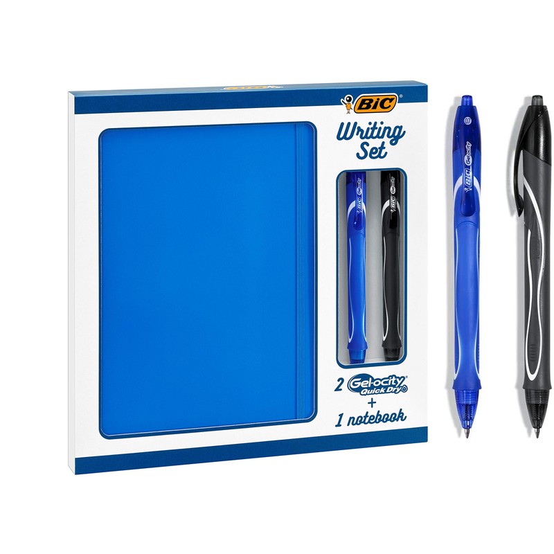 • This writing set consists of 2 Bic gel-city quick dry gel ink retractable pens and a smart matte notebook in midnight blue