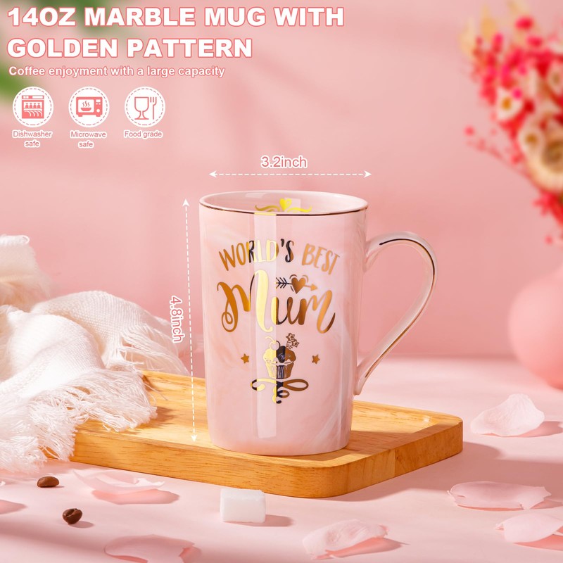 - Birthday Gifts for Mum: Unique birthday gifts for mum, each beautiful gift box contains our carefully selected and well-packaged items. Included in each luxurious gift box: 1 x 14oz Pink Marble coffee mug printed with "World's Best Mum", 1 x Matching Lid, 1 x Gold Spoon, 1 x Rose bath bomb, 1 x Soybeans wax scented candles, and a card for your special message.