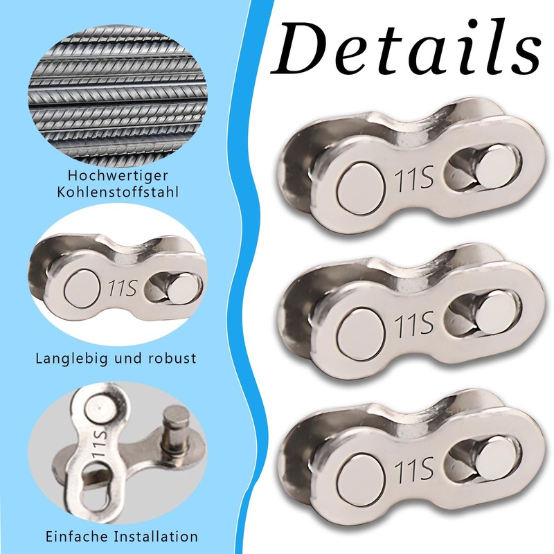 • Size: 3 pairs of silver 11-speed 11-tooth bicycle chain links. The bicycle chain link is 20 mm long, 5.5 mm wide and 7.7 mm high, well packed in a bag, convenient to carry and avoid loss. Sufficient quantity to meet your needs