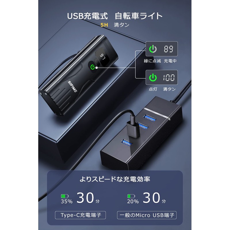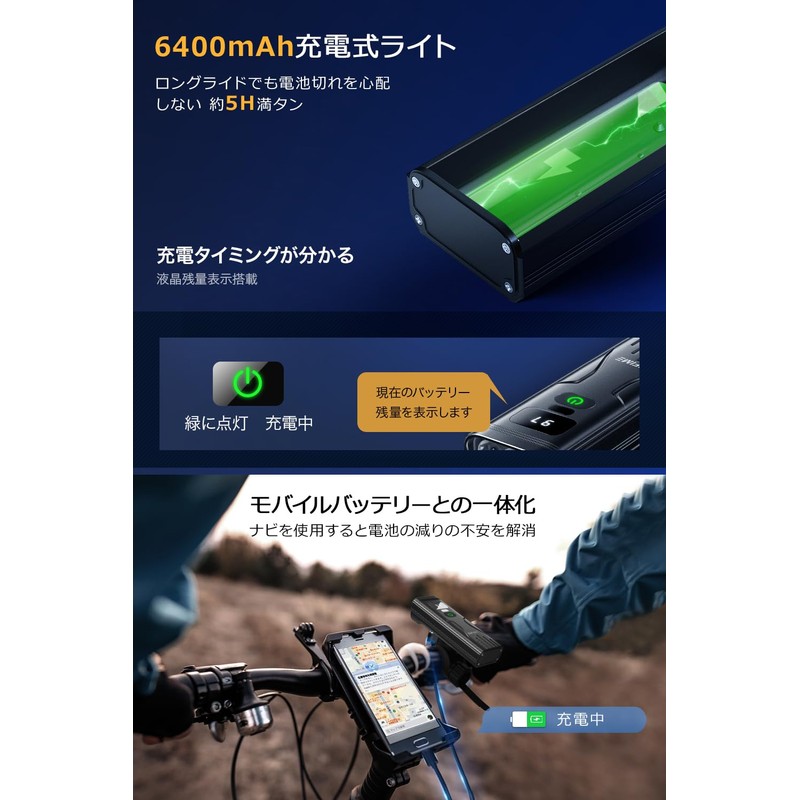 - Rechargeable bicycle light with 5 modes: Equipped with 5 modes of high, middle, low, flash, and SOS signal lights that can be adjusted to suit the road conditions and scenes. You can enjoy it on long rides without worrying about running out of battery. This USB rechargeable bicycle headlight has a built-in 6400 mAh battery that can be recharged repeatedly by connecting it to a battery or adapter. The remaining battery life is displayed, so you can see the remaining time of each mode at a glance