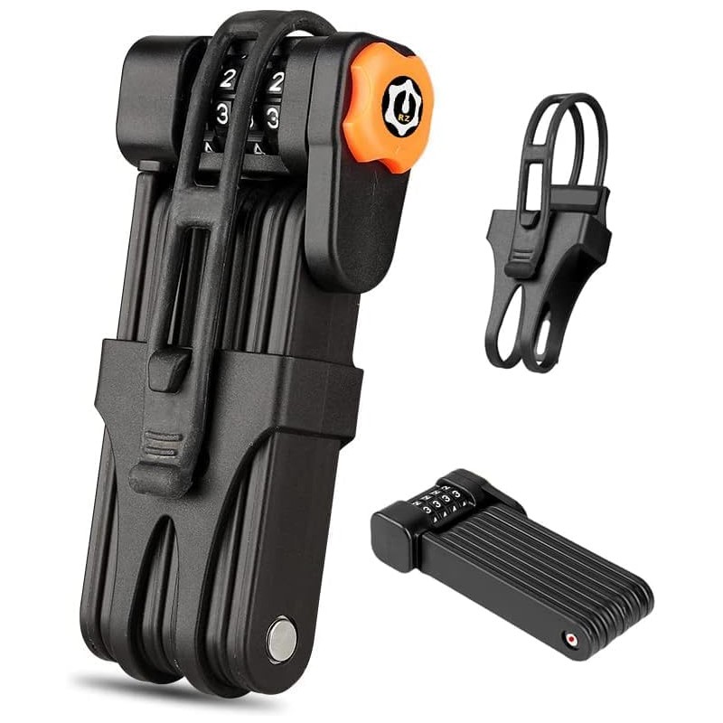 - EASY TO INSTALL & CARRY Folding bike lock is very easy to assemble and comes with a storage holder. They have a flexible attachment with non-slip Velcro straps or screws for the bottle cage on your bike, the bike lock is covered with ABS rubber paint and does not pop around to scratch your beloved bike. And 6 folding rods greatly reduces the lock size and provides lightweight flexibility in a compact design, will not take up much space, making it more convenient to carry.