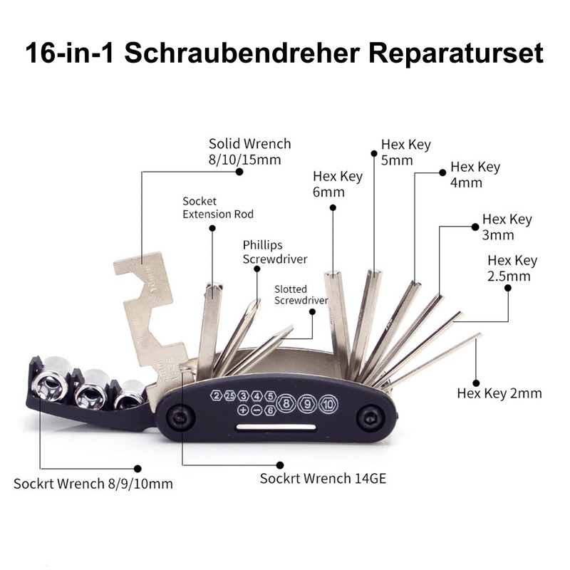 16 in 1 bicycle multi-tool: 8/9/10 mm Allen key, flat screwdriver, Phillips screwdriver, sleeve extension rod, 8/10/15 mm flat key, spoke wrench / 14GE, Allen key 2/2.5/3/4/5/6 mm.