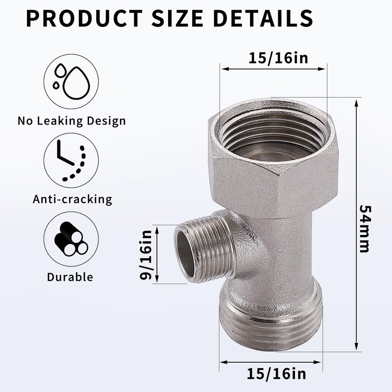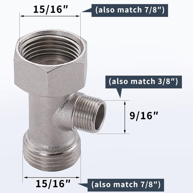 - Product Size: T Bidet Connector 3 Way 15/16inch (also match 7/8inch) connect to the toilet tank, 9/16inch (also match 3/8inch) connect to metal bidet hose, 15/16inch (also match 7/8inch)connect to the water supply hose.