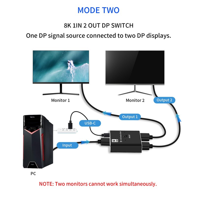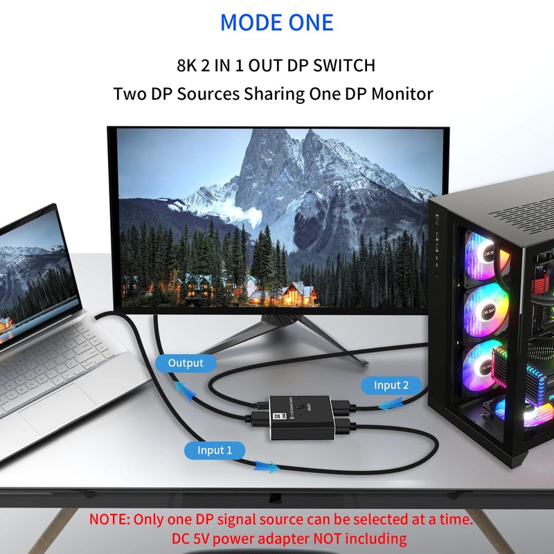 - 【Ultra HD Resolution】This display port switch 1 in 2 out/2 in 1 out supports up to 8K@60Hz and is backward compatible with resolutions such as 4K@120Hz and 1080P@60Hz, offering a transmission rate of up to 32.4Gbps and backward compatibility with all previous DP standards. Note: If the screen flickers or does not display during use, please connect the USB-C power supply and use a high refresh rate DP cable, docking station or adapter cable is not supported.