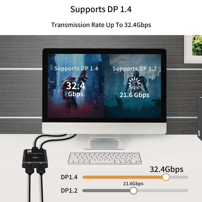 - 【Supports 32.4Gbps Ultra High Data Transmission】This displayport switcher not only supports a bandwidth of 32.4Gbps data transmission but also ensures stable high-definition audio and video display, reducing data transmission loss, improving signal transmission efficiency, and ensuring stable transmission of high-definition audio and video with synchronized sound and image without delay. Note: To use 8K60Hz resolution, please make sure your device and DP cable both support 8K.