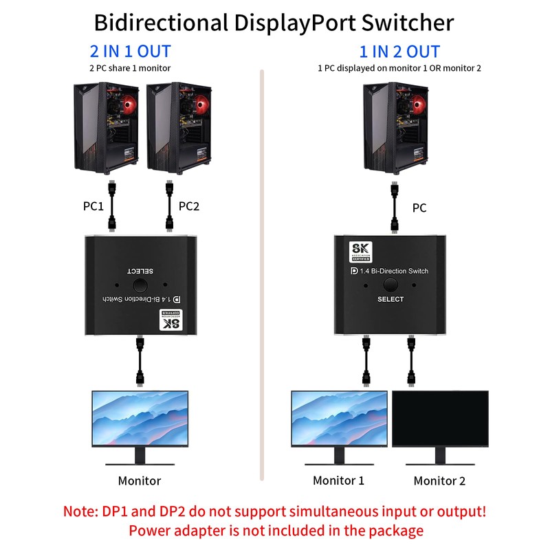 - 【Ultra HD Resolution】This display port switch 1 in 2 out/2 in 1 out supports up to 8K@60Hz and is backward compatible with resolutions such as 4K@120Hz and 1080P@60Hz, offering a transmission rate of up to 32.4Gbps and backward compatibility with all previous DP standards. Note: If the screen flickers or does not display during use, please connect the USB-C power supply and use a high refresh rate DP cable, docking station or adapter cable is not supported.