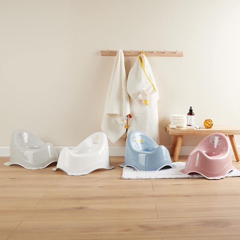 - Ergonomic potty for children in a modern design with comfortable soft edges. Hygienic due to its integrated splash protection and easy to clean by wiping it with damp cloth or sponge.